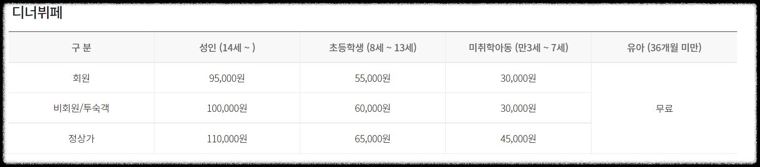 조식/디너 뷔페 이용 시 요금은 아래와 같습니다.