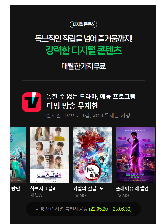 아래 KT 통신사 요금제 혜택으로만 가능합니다 [티빙 서비스 내에서 별도 구매는 불가합니다]